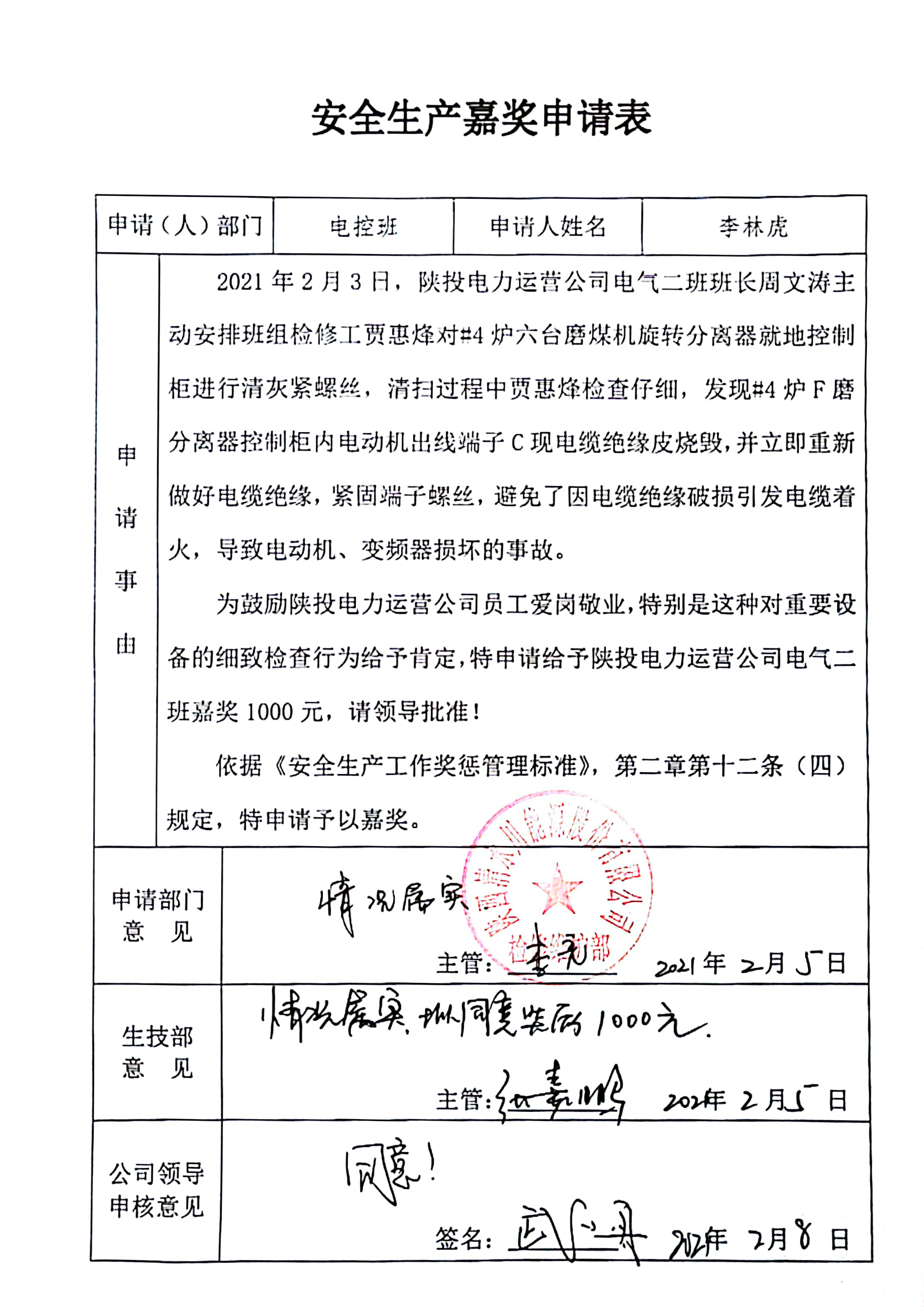2月3日,電氣專業(yè)賈惠烽、強月龍在持票檢查#4爐F磨分離器控制柜時,發(fā)現(xiàn)柜內(nèi)電動機出線端子C相電纜絕緣皮燒毀,立即逐級上報并重新恢復(fù)電纜絕緣,緊固端子螺絲,全面檢查確保柜內(nèi)其他回路完好無損,避免了因絕緣破損引發(fā)磨煤機分離器控制柜著火及磨煤機電動機、變頻器損壞等影響機組安全運行的重大事故。