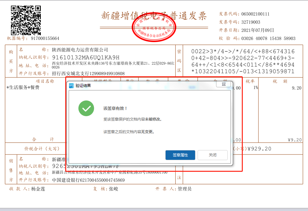 如果銷方簽名有效,顯示驗(yàn)證結(jié)果為“該簽章有效!自應(yīng)用本簽章以來,文檔內(nèi)容未被修改”。