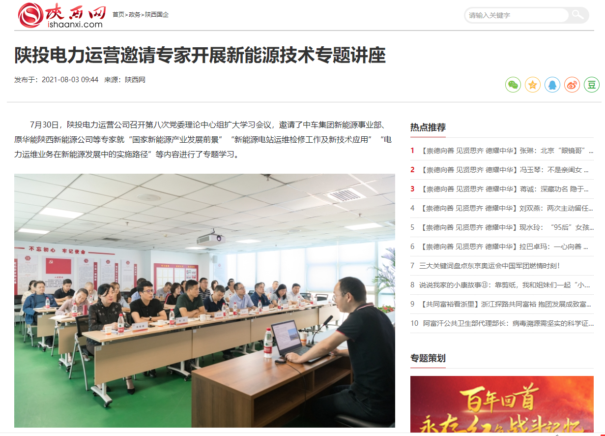 7月30日,公司召開第八次黨委理論中心組擴大學習會議,邀請了中車集團新能源事業(yè)部、原華能陜西新能源公司等專家就“國家新能源產(chǎn)業(yè)發(fā)展前景”“新能源電站運維檢修工作及新技術(shù)應用”“電力運維業(yè)務在新能源發(fā)展中的實施路徑”等內(nèi)容進行了專題學習。