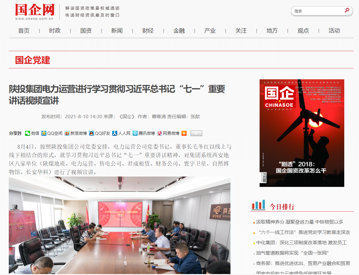 8月4日,按照陜投集團公司黨委安排,電力運營公司黨委書記、董事長毛冬紅以線上與線下相結(jié)合的形式,就學(xué)習(xí)貫徹習(xí)近平總書記“七一”重要講話精神,對集團系統(tǒng)西安地區(qū)八家單位(陜煤地質(zhì)、電力運營、售電公司、君成租賃、財務(wù)公司、寰宇衛(wèi)星、自然博物館、長安華科)進行了視頻宣講。