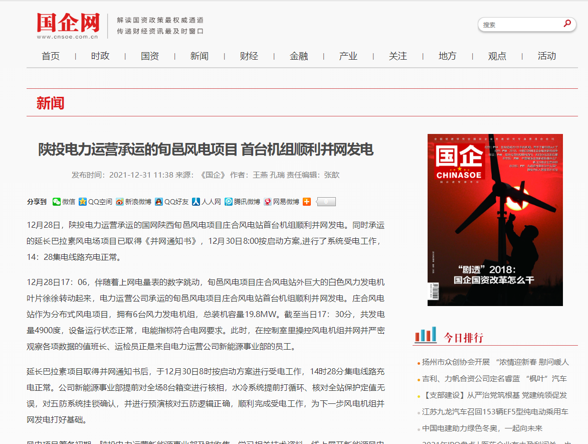 國企網(wǎng):陜投電力運營承運的首臺風電機組順利并網(wǎng)發(fā)電