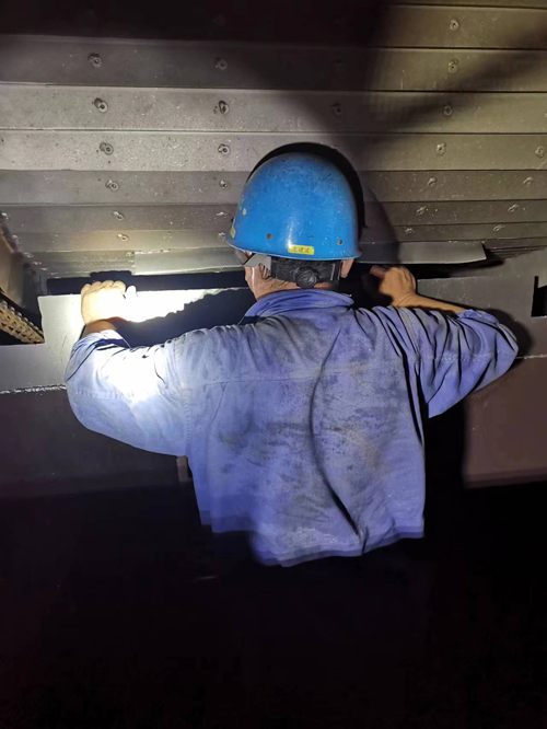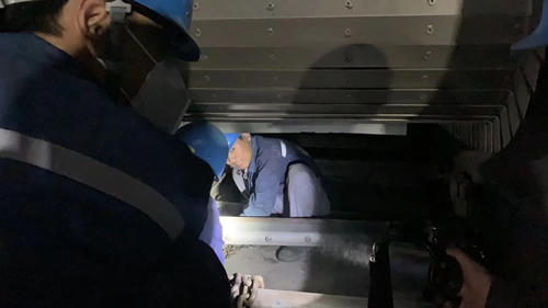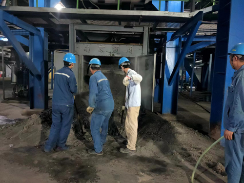 白天除了要完成檢修準(zhǔn)備工作,還要清理堆積如山的積渣積灰。因煤質(zhì)原因,每隔2小時(shí)就要用3米多長的管子伸進(jìn)爐膛打焦。爐膛的高溫不一會(huì)兒就會(huì)將管子前端燒得通紅。時(shí)值三伏時(shí)節(jié),現(xiàn)場悶熱難耐、粉塵飛揚(yáng),汗水混著粉塵在臉上流淌。積渣積灰清掃工作是對(duì)檢修人員體力和耐力的嚴(yán)峻考驗(yàn)。#1鋼帶距離地面只有50多公分高,只能蜷縮身體鉆進(jìn)去,螞蟻搬家似的一點(diǎn)點(diǎn)掏出積渣積灰。大家心往一處想、勁往一處使,只想著讓干渣機(jī)盡早正常運(yùn)轉(zhuǎn)。