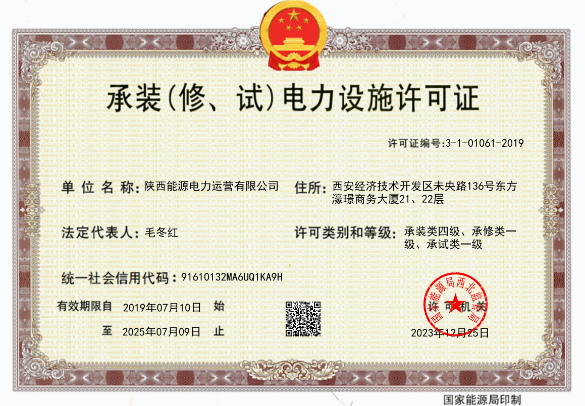 12月25日,公司正式獲得國家能源局西北監(jiān)管局頒發(fā)的承修、承試電力設(shè)施一級(jí)資質(zhì)許可證,成為陜西省第7家同時(shí)擁有該兩項(xiàng)資質(zhì)的企業(yè),公司資質(zhì)建設(shè)取得新突破。