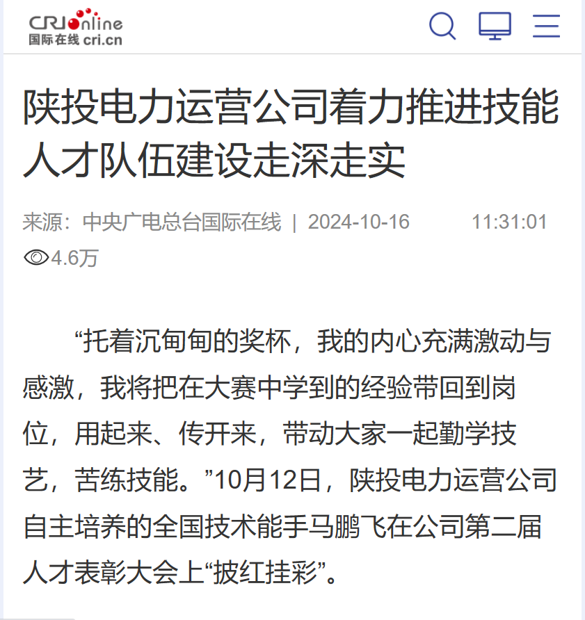 “托著沉甸甸的獎(jiǎng)杯,我的內(nèi)心充滿激動(dòng)與感激,我將把在大賽中學(xué)到的經(jīng)驗(yàn)帶回到崗位,用起來(lái)、傳開來(lái),帶動(dòng)大家一起勤學(xué)技藝,苦練技能。”10月12日,陜投電力運(yùn)營(yíng)自主培養(yǎng)的全國(guó)技術(shù)能手馬鵬飛在公司第二屆人才表彰大會(huì)上“披紅掛彩”。