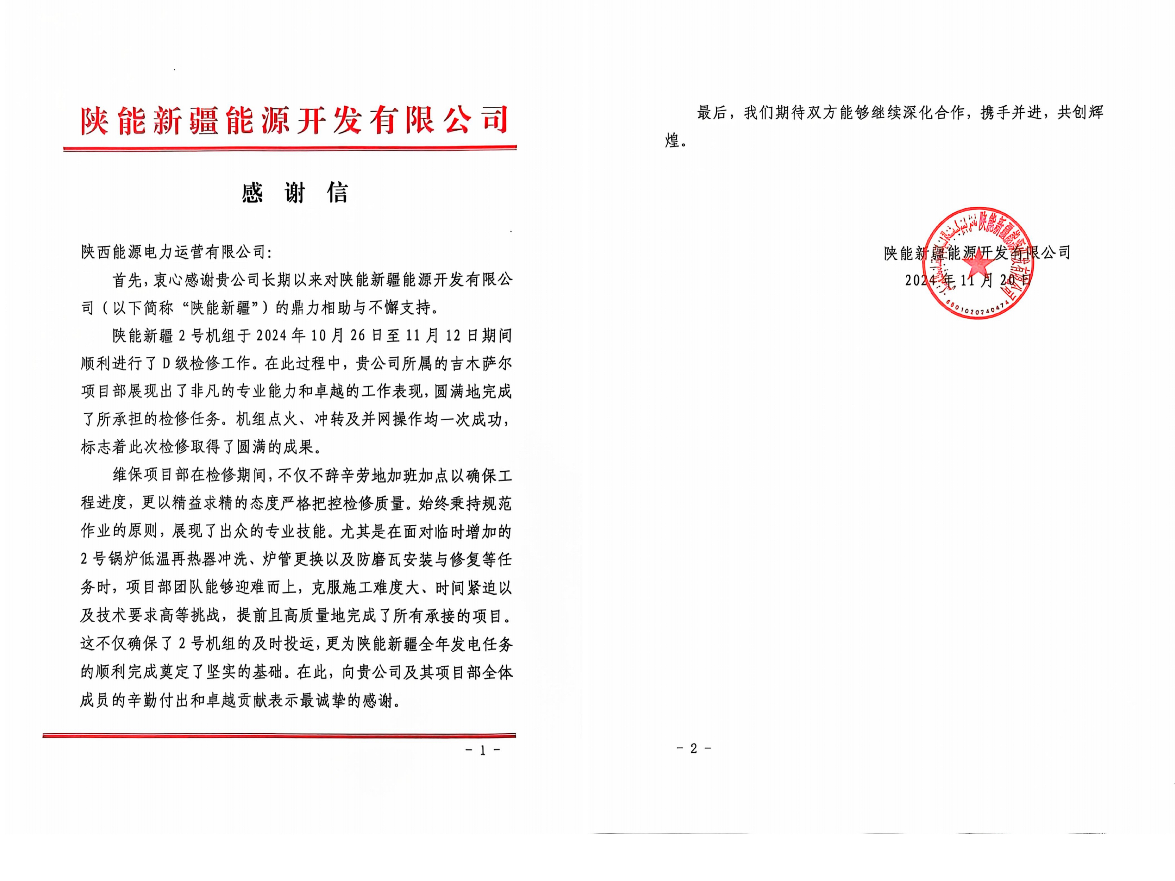 日前,陜能新疆發(fā)來感謝信,對(duì)吉木薩爾項(xiàng)目部高效優(yōu)質(zhì)完成#2機(jī)D修項(xiàng)目表示感謝。