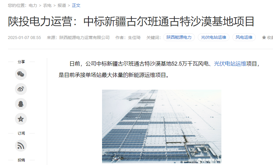 日前,公司中標(biāo)新疆古爾班通古特沙漠基地52.5萬千瓦風(fēng)電、光伏電站運維項目,是目前承接單場站最大體量的新能源運維項目。