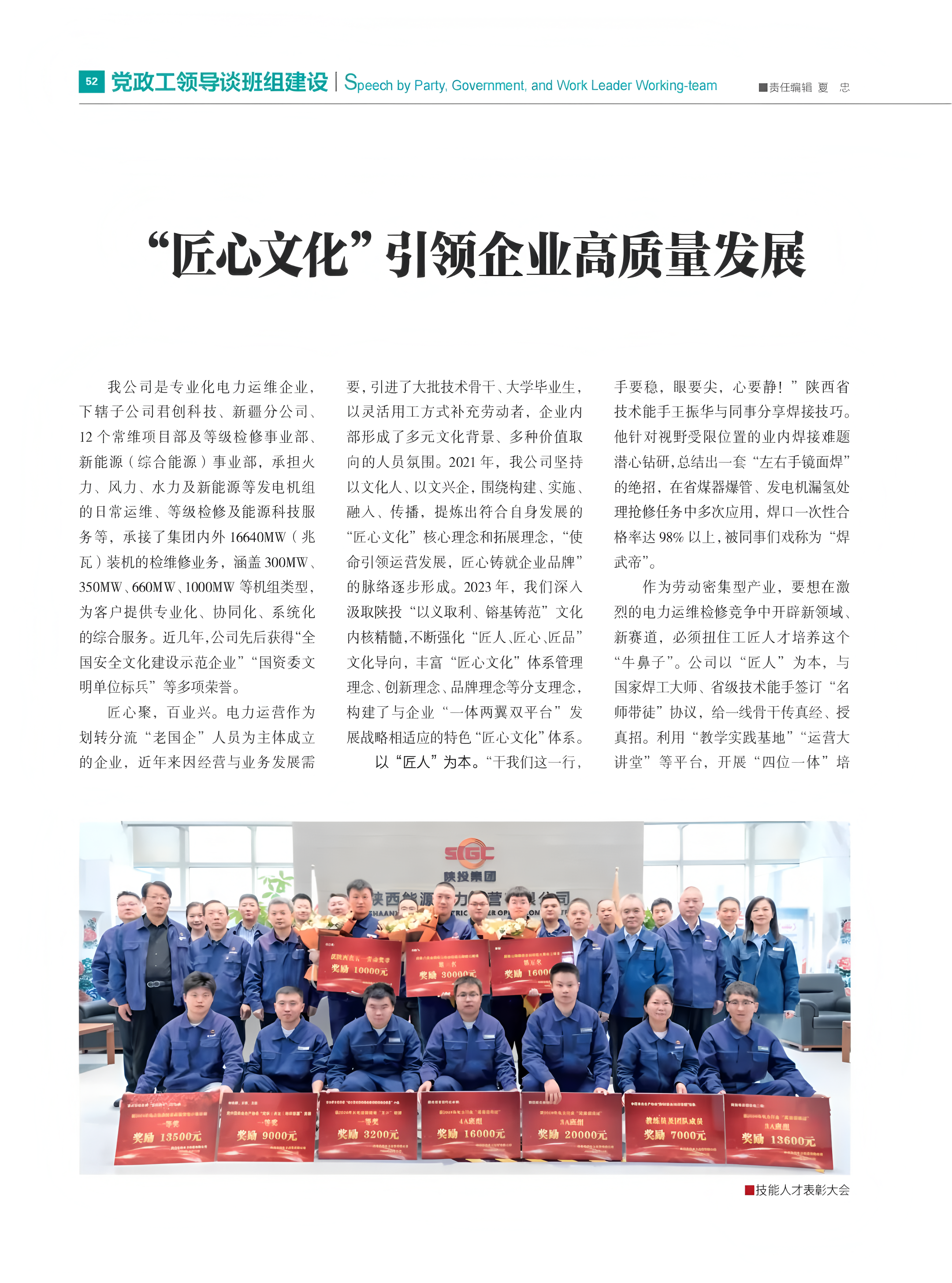 “匠心”不僅是對(duì)極致工藝的精細(xì)追求,更是對(duì)先進(jìn)科技的虛心學(xué)習(xí),公司樹(shù)立科創(chuàng)效治思維,以“匠心”為鏡,鑒機(jī)識(shí)變、觀(guān)瞻前沿,不斷深挖現(xiàn)場(chǎng)技術(shù)難題、熟悉行業(yè)前沿技術(shù)應(yīng)用,讓科技創(chuàng)新賦能檢修維保增“智”提質(zhì),多項(xiàng)創(chuàng)新成果斬獲全國(guó)火電運(yùn)維檢修“五小”創(chuàng)新成果一等獎(jiǎng)。電力運(yùn)營(yíng)聚焦電力運(yùn)維、等級(jí)檢修、能源科技服務(wù)及新能源等領(lǐng)域開(kāi)展課題研究,持續(xù)推進(jìn)技術(shù)研發(fā)和成果轉(zhuǎn)化工作,8個(gè)項(xiàng)目入選省重點(diǎn)新產(chǎn)品開(kāi)發(fā)目錄,取得全國(guó)電力行業(yè)質(zhì)量管理小組一等獎(jiǎng) 2項(xiàng)、陜西省電力行業(yè)質(zhì)量管理小組活動(dòng)成果一等獎(jiǎng)4項(xiàng)、火電運(yùn)維檢修“五小”創(chuàng)新一等獎(jiǎng)7項(xiàng),科技成果不斷涌現(xiàn)。陸續(xù)開(kāi)發(fā)上線(xiàn)“火電廠(chǎng)檢修運(yùn)維生產(chǎn)安全管理系統(tǒng)"“煤粉自動(dòng)均衡測(cè)控系統(tǒng)”等科技產(chǎn)品,實(shí)施“光伏數(shù)據(jù)分析智能診斷”應(yīng)用模塊,加快低代碼生產(chǎn)信息管理平臺(tái)建設(shè)進(jìn)度和成果應(yīng)用,將自主知識(shí)產(chǎn)權(quán)轉(zhuǎn)化為高新技術(shù)產(chǎn)品及服務(wù),讓更多“匠心”之造融入新型電力系統(tǒng)建設(shè)。