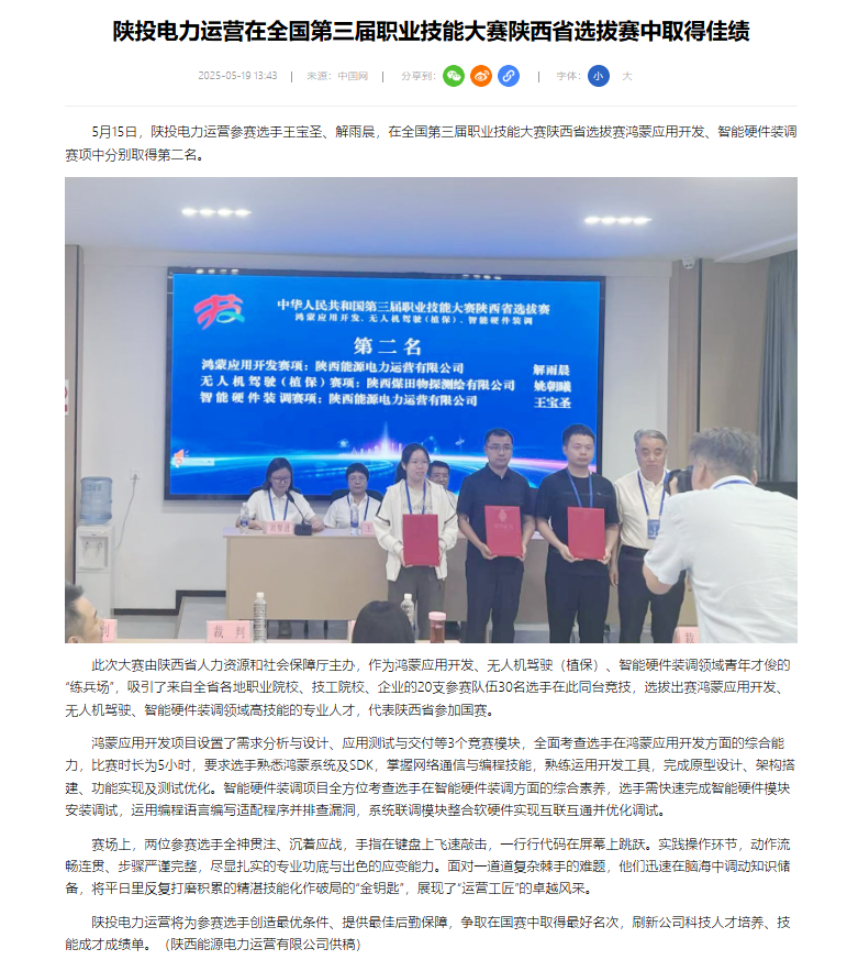 5月15日,陜投電力運營參賽選手王寶圣、解雨晨,在全國第三屆職業(yè)技能大賽陜西省選拔賽鴻蒙應用開發(fā)、智能硬件裝調(diào)賽項中分別取得第二名。