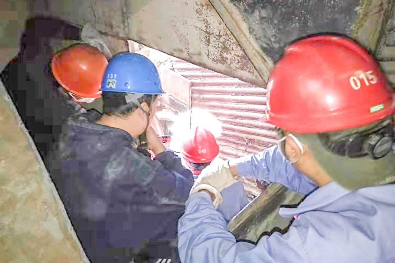 近日,商電#2機(jī)組停運(yùn)后,鍋爐班人員檢查發(fā)現(xiàn)爐水冷壁管道標(biāo)高20米處有一砂眼,但由于爐膛外管道錯(cuò)綜復(fù)雜,作業(yè)地點(diǎn)又處于風(fēng)箱內(nèi)部,給檢修工作帶來極大的困難。工作人員在割掉2塊鋼板,穿過層層障礙,到達(dá)工作面后,又發(fā)現(xiàn)水冷壁管外還有三塊限位鋼板擋在面前。最終,排除重重“攔路虎”后,工作人員內(nèi)外配合,經(jīng)過一天緊張的割管、制口和焊管工作,圓滿完成此項(xiàng)任務(wù)。