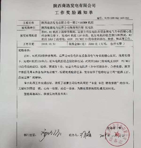11月6日,商洛項目部收到商洛發(fā)電工作獎勵5000元,以表彰儀電隊在近期加班加點(diǎn)完成#1機(jī)組159臺電機(jī),#2機(jī)組10kV2段母線修檢和預(yù)試等工作。這是今年以來,項目部繼鍋爐班順利完工脫硫系統(tǒng)改造管道,獎勵5000元;汽化水班如期完成#1機(jī)組主汽閥、調(diào)閥解體,獎勵3000元;鍋爐班副班長李海峰發(fā)現(xiàn)#2爐螺旋水冷壁泄露重大缺陷,獎勵個人2000元后,收到的第四筆業(yè)主方工作獎勵。