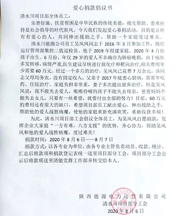 近日,在得知清水川能源職工吳風(fēng)風(fēng)愛人不幸身染重病,目前在醫(yī)院治療,費(fèi)用仍有很大缺口的消息后,清水川項(xiàng)目部分工會(huì)立即向全體職工發(fā)出倡議,號(hào)召大家發(fā)揚(yáng)互助、關(guān)愛的精神,伸出手來幫助吳風(fēng)風(fēng)和家人戰(zhàn)勝病魔,渡過難關(guān)!