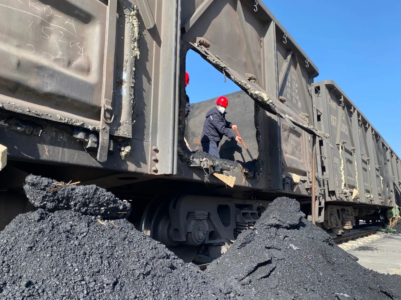 1月12日,商洛項(xiàng)目部從管理干部中緊急抽調(diào)18名人員奔赴煤場(chǎng),對(duì)“凍煤”展開人工清理。清理凍煤是一項(xiàng)費(fèi)勁的體力活,更是一項(xiàng)費(fèi)時(shí)的細(xì)活。車廂內(nèi),工作人員有序分工,揮動(dòng)鐵鎬和鐵鍬,清理著車廂底部、拐角等處的凍煤。厚厚的凍煤堅(jiān)硬如鐵,工作人員掄圓胳膊,使勁揮動(dòng)鎬頭卻只“啃”下很小的一塊。一鎬鎬挖,一塊塊敲,一點(diǎn)點(diǎn)清,清理完一節(jié)車廂,汗水早已濕透了棉服,卻沒有一個(gè)人停下手上的活,又馬不停蹄轉(zhuǎn)戰(zhàn)另一節(jié)車廂。